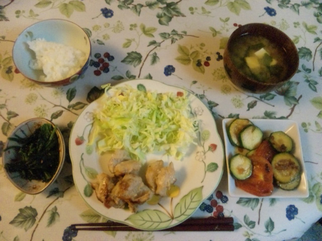 ごはん、豆腐とわかめの味噌汁、ズッキーニとトマトの何か、キャベツと鶏肉、ほうれん草