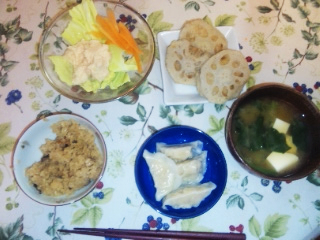 左上から時計回りにタラモサラダ、レンコンのはさみ揚げ、ほうれん草と豆腐の味噌汁